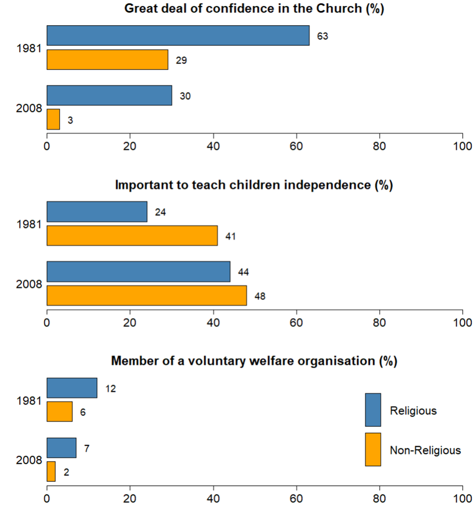The figures depict, in descending order, the proportion of respondents who: (1) believe the Church provides answers to moral problems; (2) believe it is important to teach children to be independent; and (3) report membership in voluntary welfare organisations. The first figure reflects the Church’s societal authority, while the latter two indicate the strength of the ideological and practical components of solidaristic social capital.